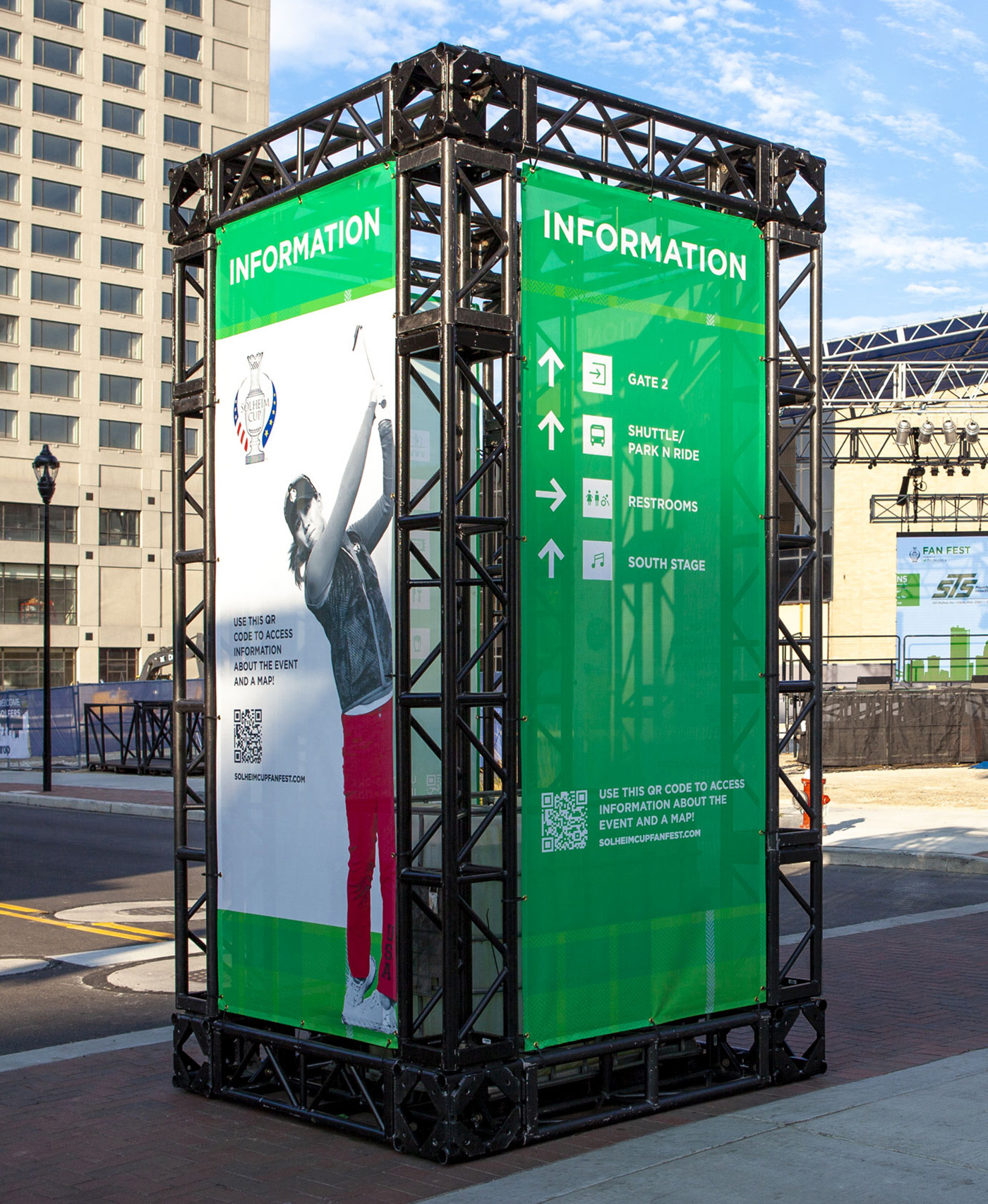 Building off the look and feel established by the LPGA, we created a unique brand for the two-day celebration. Starting with a custom tartan plaid, several touchpoints were created to represent both the American and European team colors participating in the tournament. The look was extended to the main concert stage, entry gates, fence scrim, tent signage, tickets, and 40-ft tall banners. It was the first time the fan event was held outside the course footprint and we were honored to be chosen to dress the venue.
